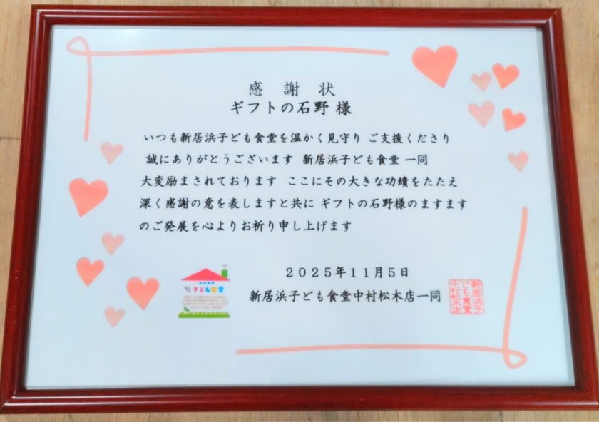 『新居浜 子ども食堂』さんの 学生ボランティア様から 当店に 素敵な感謝状を頂きました😊