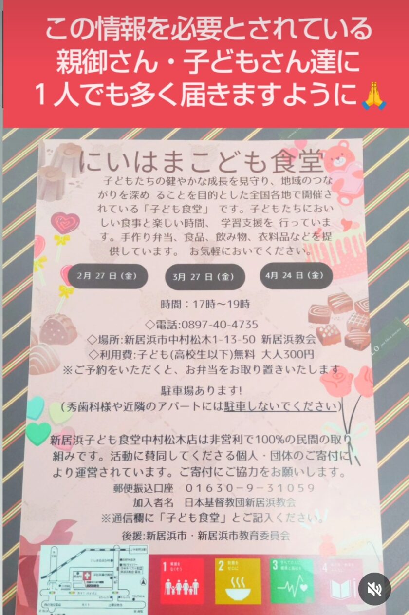 この情報を必要とされている親御さん、 そして 子どもさん達に、 1人でも 多く届きますように。 ※当店は『新居浜子ども食堂』さんの 【子ども支援活動】を応援しており、 宗教的な関わりは 一切ございません。