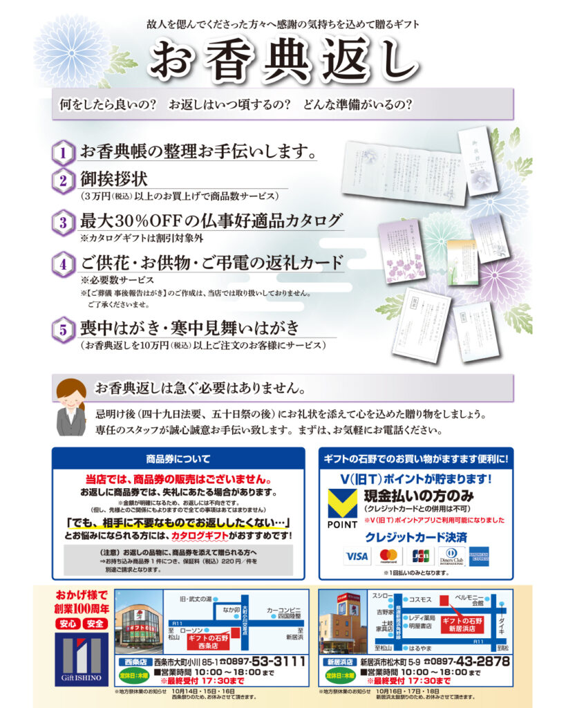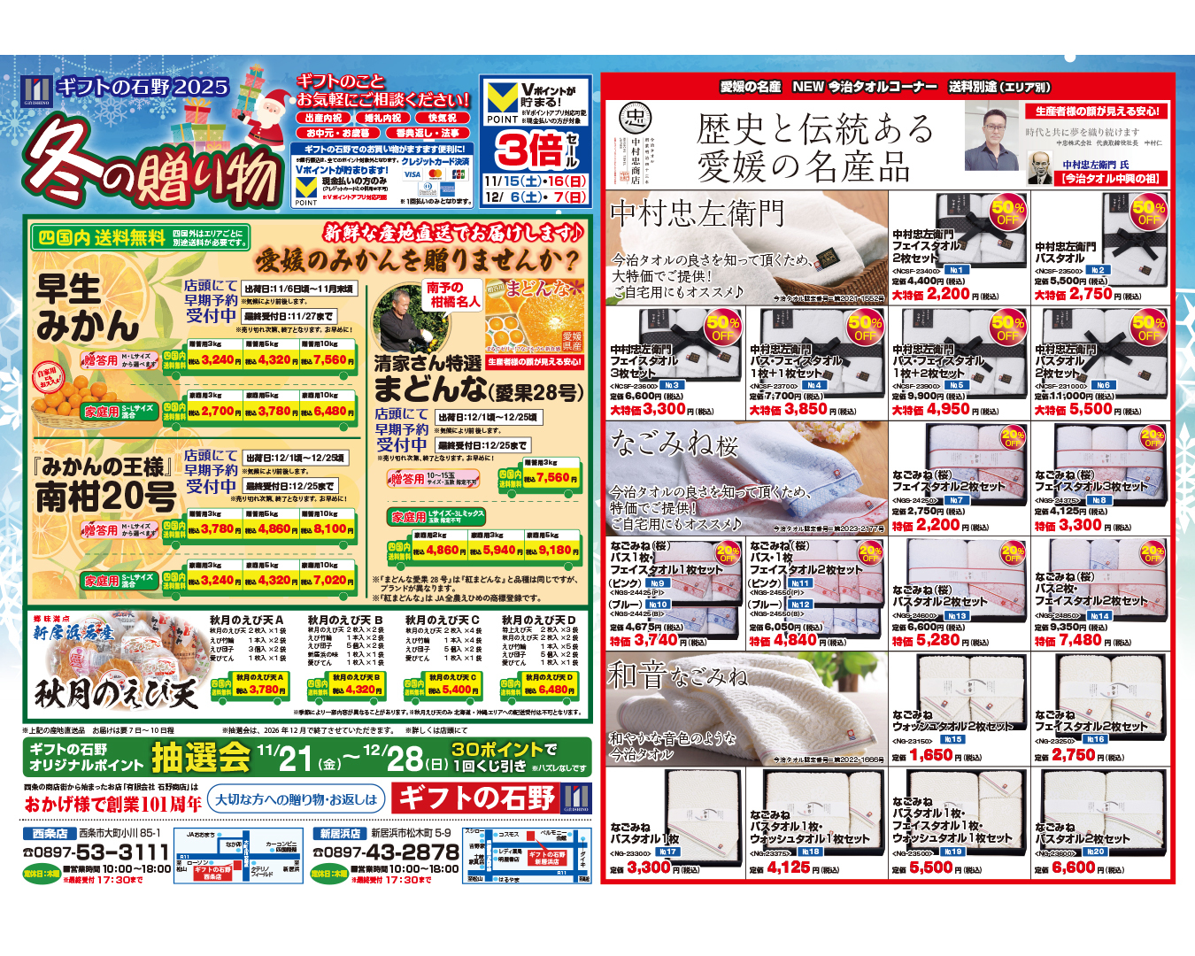 1924年に創業した石野陶器店に始まり、1981年にギフト業界のトップクラス企業・シャディとの代理店契約を結び、西条店を出店、続いて1986年に新居浜店を出店しました。