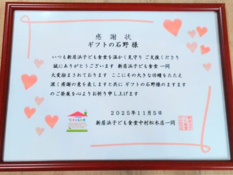 『新居浜 子ども食堂』さんの 学生ボランティア様から 当店に 素敵な感謝状を頂きました😊