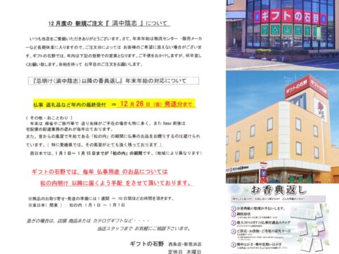 【重要なお知らせ】 仏事返礼品(香典返し等)の 年内発送の最終受付日が、 『12月26日(金)』となります。 ーーーーーーーーー 年末はお仕事で ご帰宅が 遅くなったり、帰省やご旅行等で、 送り先様が ご不在の場合が 最...