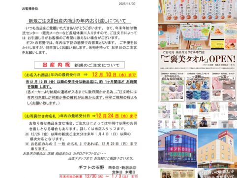 【重要なお知らせ】 年末に多数のご注文を戴いている出産内祝の 当店オリジナル『お写真入り命名札』ですが、年内の最終受付日が『12月24日(水)』となります。 ※印刷所さんの年内受付 最終日となります ※命名札のみの販売は...